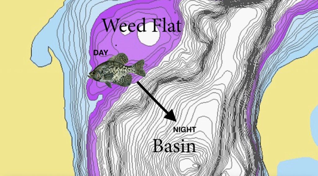 So, when you’re looking for crappies during the day, find a flat adjacent to deep water and work that first edge until you find the last standing weeds of the year and usually you will find fish set up somewhere along that weed edge.