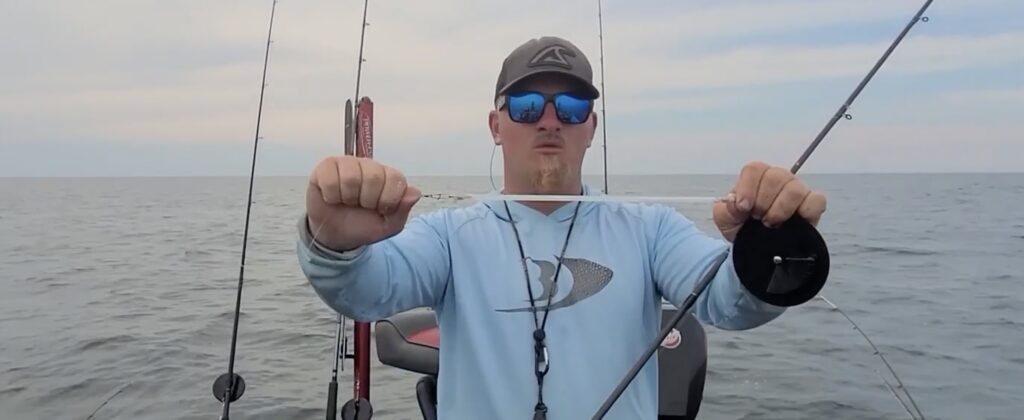 After the snubber, or right after the Dipsy Diver, Max uses an 8-9′ leader of 20lb fluorocarbon. The heavier line not only has great abrasion resistance and durability but also has a bit more floatation to it to help keep that bait up in the water column.