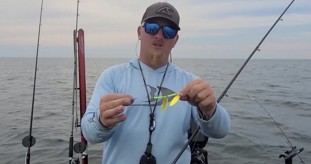 Max uses two different baits behind his Dipsy Divers depending on the bite: double willow crawler harnesses or shallow diving cranks in smelt patterns. Double willow harnesses are essentially a traditional short crawler harness with dual willow blades. Where a traditional crawler harness requires 1.2-1.3 mph, the double willow crawler harness can troll at 2.5mph allowing them to be ran next to crankbaits. Max will often run both of these baits simultaneously to let the fish tell him what they currently prefer.